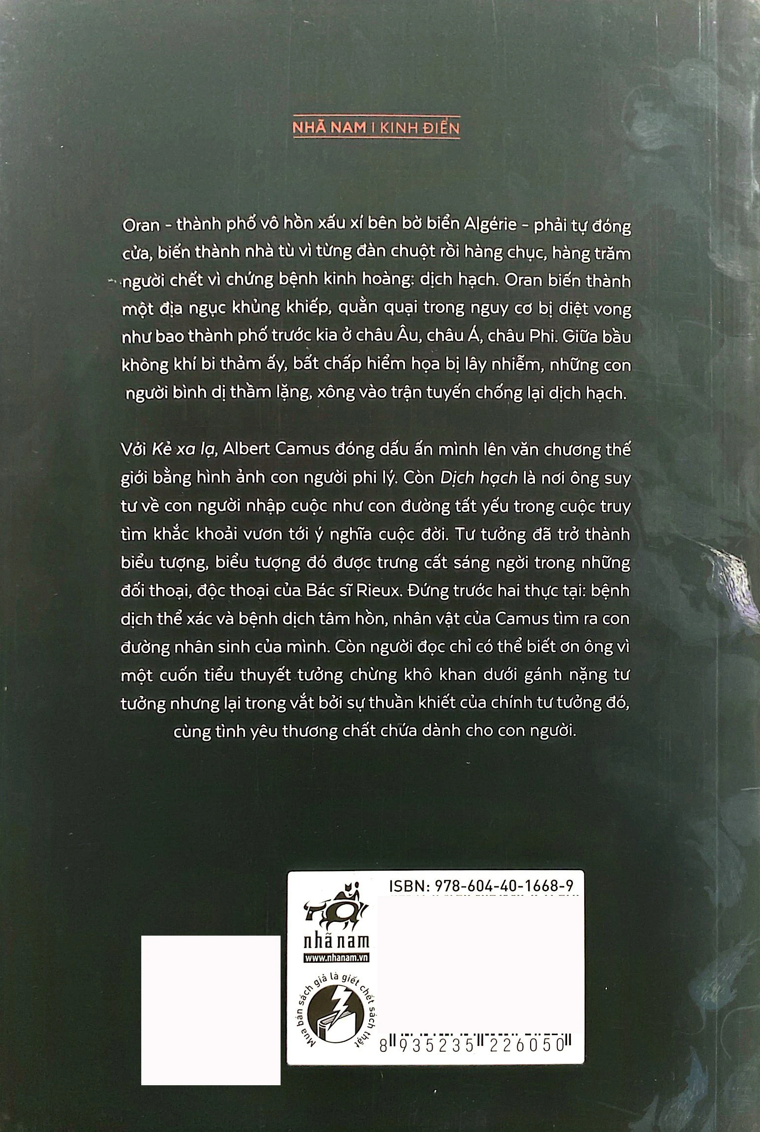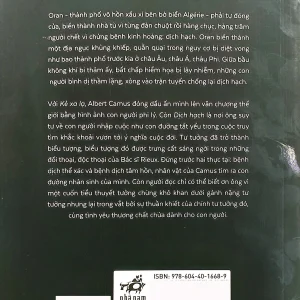 Tư tưởng đã trở thành biểu tượng, biểu tượng đó được trưng cất sáng ngời trong những đối thoại, độc thoại của Bác sĩ Rieux. Đứng trước hai thực tại: bệnh dịch thể xác và bệnh dịch tâm hồn, nhân vật của Camus tìm ra con đường nhân sinh của mình. Còn người đọc chỉ có thể biết ơn ông vì một cuốn tiểu thuyết tưởng chừng khô khan dưới gánh nặng tư tưởng nhưng lại trong vắt bởi sự thuần khiết của chính tư tưởng đó, cùng tình yêu thương chất chứa dành cho con người. GIỚI THIỆU TÁC GIẢ: Albert Camus (1913-1960) là một trong những tên tuổi nổi bật trên văn đàn Pháp trong những thập kỷ giữa và sau chiến tranh thế giới thứ hai. Tác phẩm của Camus gồm các thể loại tiểu thuyết, kịch, truyện ngắn, tùy bút và tiểu luận gây nên những cuộc tranh luận sôi nổi ở Pháp và nhiều nước trên thế giới.