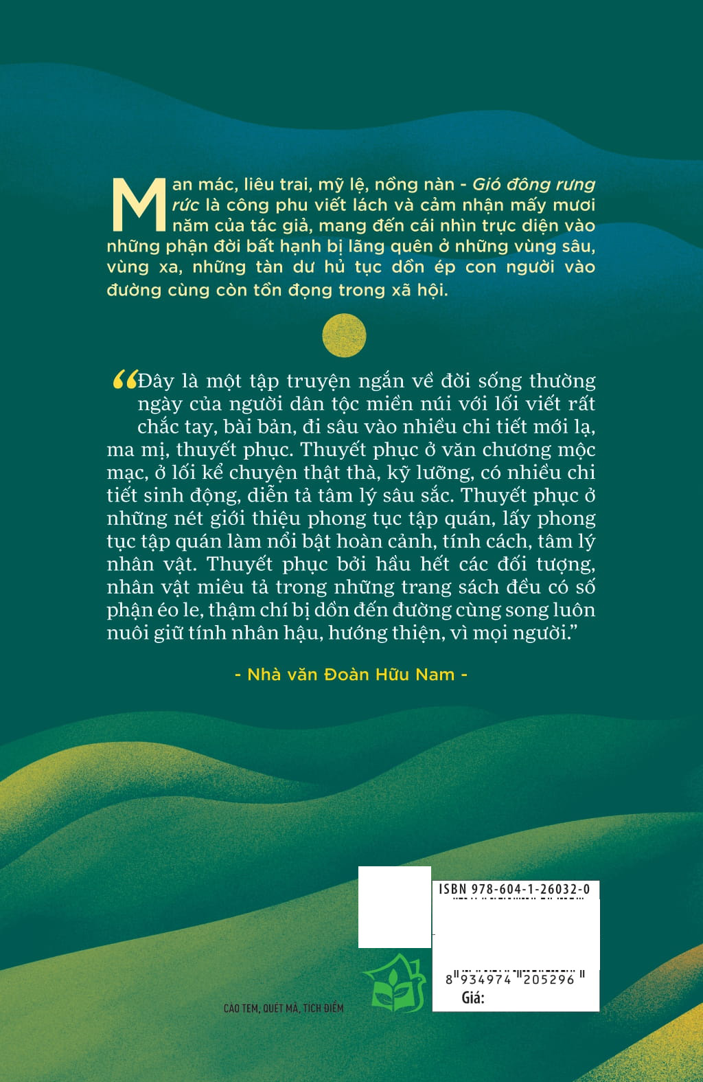 Man mác, liêu trai, mỹ lệ, nồng nàn – “Gió đông rưng rức” là tuyển tập gồm 10 truyện ngắn của nhà văn Hoàng Lệ Thủy. Đến với Sơn La từ năm 19 tuổi, công tác tại Bệnh viện Y Dược cổ truyền Sơn La, nhà văn đã có dịp tiếp xúc và gắn bó dài lâu với vùng đất này. Tác phẩm là công phu viết lách và cảm nhận mấy mươi năm của tác giả, mang đến cái nhìn trực diện vào những phận đời bất hạnh bị lãng quên ở những vùng sâu, vùng xa, những tàn dư hủ tục giết chết con người còn tồn đọng trong xã hội.