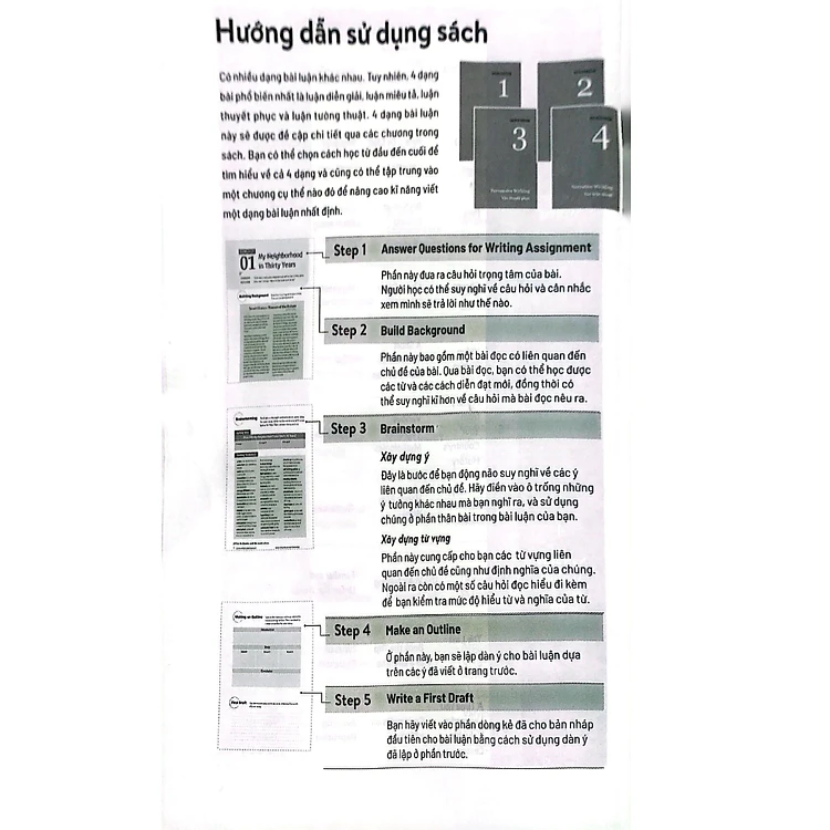 How to Write 4 Types of Essays – Từng bước làm quen với viết luận tiếng Anh sẽ giúp người học làm quen và từng bước chinh phục kĩ năng quan trọng này. Cuốn sách tập trung giới thiệu 4 dạng bài luận tiếng Anh phổ biến nhất, đó là: