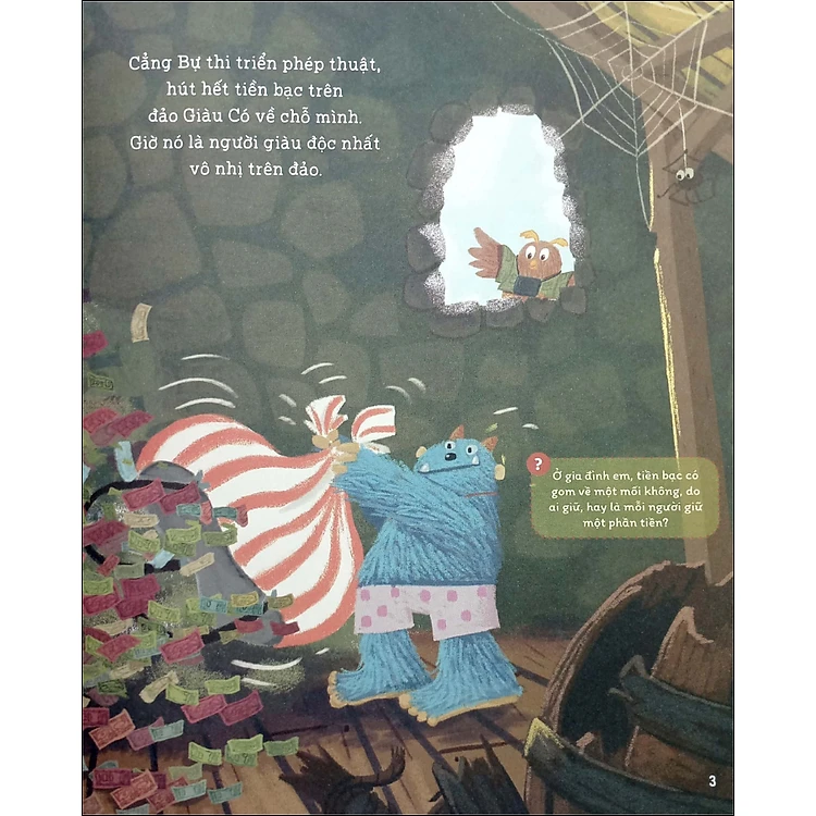 Nếu một ngày kia em rất muốn có một chiếc kẹo của cô bạn thân, mà em lại đang dư mấy túi bánh, em có nghĩ đến một cuộc trao đổi? Cuốn sách này kể về lần Cẳng bự chiếm tất cả tiền trên đảo Giàu có về tay mình và gây nên một sự hỗn loạn. Nhìn vào chuỗi hỗn loạn đó, em sẽ học về cách lưu thông hàng hóa khi không có tiền, cách cân đối giá trị hàng hóa, cách trả giá và thương lượng.