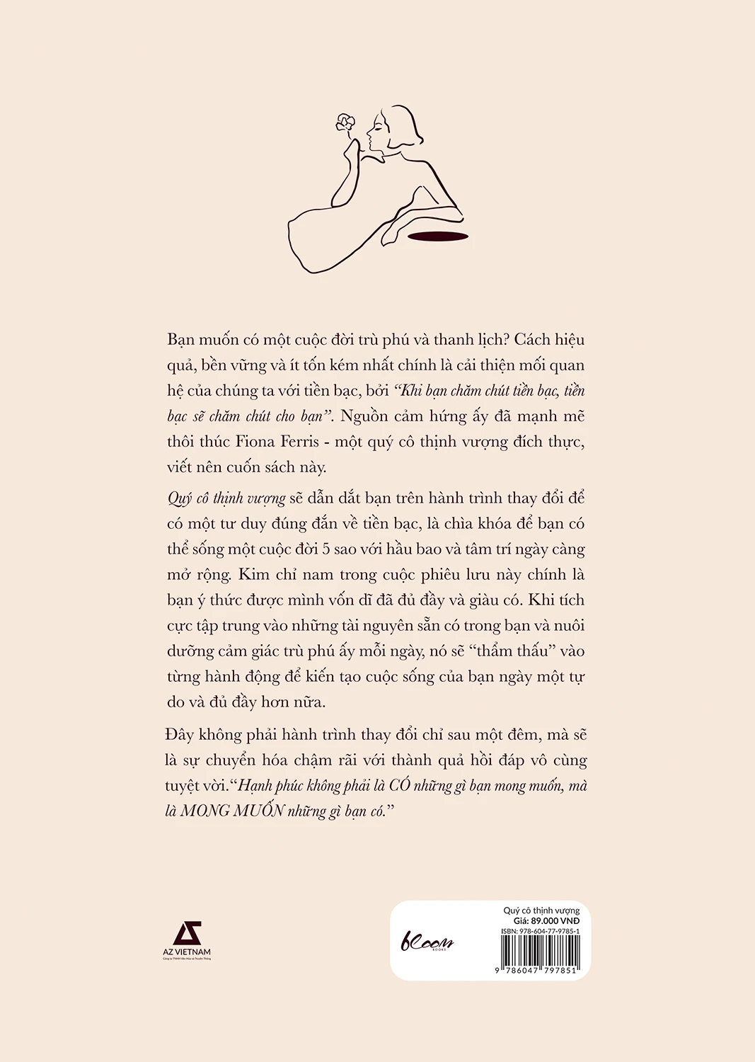 Bạn muốn có một cuộc đời trù phú và thanh lịch? Cách hiệu quả, bền vững và ít tốn kém nhất chính là cải thiện mối quan hệ của chúng ta với tiền bạc, bởi “Khi bạn chăm chút tiền bạc, tiền bạc sẽ chăm chút cho bạn”. Nguồn cảm hứng ấy đã mạnh mẽ thôi thúc Fiona Ferris – một quý cô thịnh vượng đích thực, viết nên cuốn sách này.
